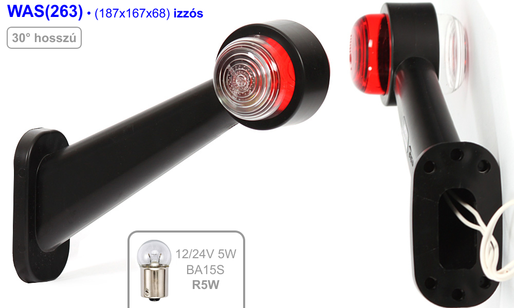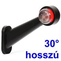 (FT-009C) 7.12 LED gumiszarv 30° hosszúTermékinformáció: LED-es 30°-os hosszú gumiszarv szélességjelző kerek kivitelű fejjel, előre fehér, hátra piros fénnyel, gyárilag vezetékelőkészítéssel. A lámpa színesbúrás kivitelű. Ajánljuk utánfutók, pótkocsik, csónak- és jet-ski szállítók hátsó sarokpontjainak fényjelzéssel való ellátására. Mérete (kinyúlás oldalfalról x magasság x mélység): 192 x 135 x 45mm. Működtető feszültség: 12V-30V.